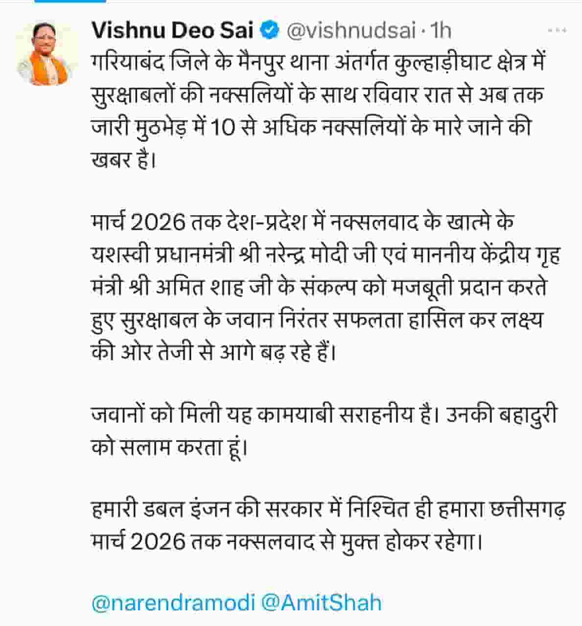 मुख्यमंत्री ने कहा कि देश और प्रदेश में नक्सलवाद के खात्मे के लिए प्रधानमंत्री नरेंद्र मोदी और केंद्रीय गृहमंत्री अमित शाह के संकल्प को सुरक्षाबलों ने अपनी बहादुरी से मजबूती दी है। “हमारी डबल इंजन की सरकार के प्रयासों से छत्तीसगढ़ मार्च 2026 तक नक्सलवाद मुक्त राज्य बनेगा।”