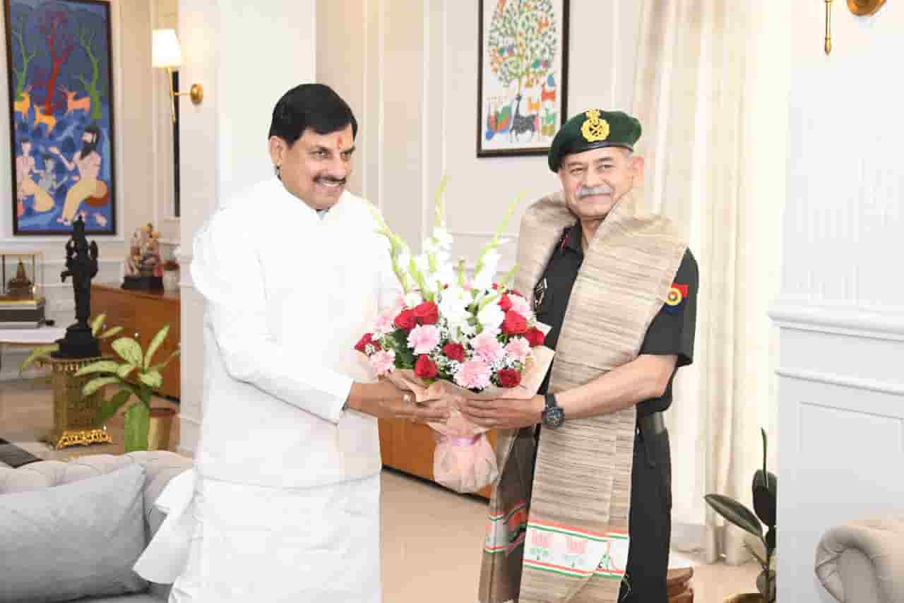 मुख्यमंत्री डॉ. मोहन यादव ने चीफ़ ऑफ़ आर्मी स्टॉफ जनरल उपेंद्र द्विवेदी का समत्व भवन (मुख्यमंत्री निवास) में पुष्प-गुच्छ भेंट कर स्वागत किया
