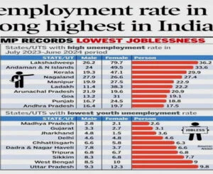 Periodic Labour Force Survey (PLFS) की रिपोर्ट ने देश भर के विभिन्न राज्यों में बेरोजगारी के आंकड़ों का भी खुलासा किया है। इस रिपोर्ट के अनुसार, केरल में बेरोजगारी दर सबसे अधिक रही, जहां 15-29 वर्ष की आयु वर्ग के युवाओं में बेरोजगारी दर 29.9% दर्ज की गई। केरल में महिलाओं में बेरोजगारी दर 47.1% और पुरुषों में 19.3% रही। इसके अलावा, लक्षद्वीप में बेरोजगारी दर सबसे अधिक 36.2% दर्ज की गई, जिसके बाद अंडमान और निकोबार द्वीप समूहमें यह दर 33.6% रही।