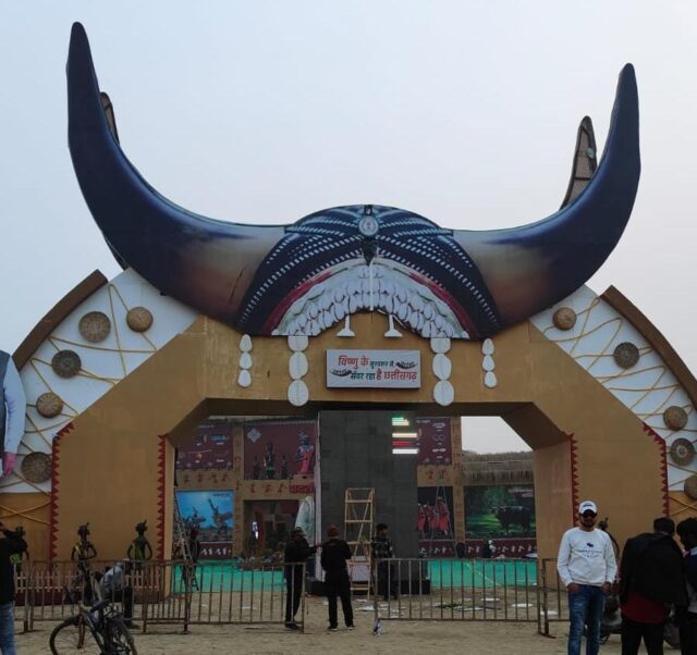 छत्तीसगढ़ पैवेलियन का प्रवेश द्वार बस्तर की पहचान गौर मुकुट से सुशोभित था। ये दूर से ही लोगों को अपनी तरफ आकर्षित कर लेता था। भीतर प्रवेश करते ही छत्तीसगढ़ महतारी की प्रतिमा छत्तीसगढ़ की ममतामयी पहचान को परिलक्षित करती थी। इसके साथ ही राज्य की चार ईष्ट देवियों ( मां महामाया, मां दंतेश्वरी, मां बम्लेश्वरी और मां चंद्रहासिनी) की तस्वीरों के आगे लोगों के सिर श्रद्धा से झुक जाते थे। प्रदर्शनी में राज्य सरकार की योजनाओं को जानने के लिए लोग आतुर दिखते थे। प्रदर्शनी में सिरपुर, कुतुबमीनार से ऊंचे जैतखाम, भारत का नियाग्रा कहे जाने वाले चित्रकोट वाटरफाल, आधुनिक शहर नया रायपुर के बारे मे जानकर लोग स्तब्ध रह जाते थे।