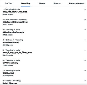 रायपुर। छत्तीसगढ़ का बजट आज एक्स पर ट्रेंड में पहले स्थान पर रहा। पांच बजे तक इस संबंध में 6 हजार 196 पोस्ट किये जा चुके थे। मुख्यमंत्री श्री विष्णु देव साय सरकार ने इस बजट का थीम ज्ञान के लिए गति रखा था। मुख्यमंत्री श्री विष्णु देव साय सरकार के कैबिनेट में वित्त मंत्री श्री ओपी चौधरी ने यह बजट आज विधानसभा में प्रस्तुत किया। पिछले बजट में ज्ञान पर जोर दिया गया था जिसका तात्पर्य यह था कि यह बजट गरीब, युवा, अन्नदाता और नारीशक्ति पर आधारित है। यह प्रधानमंत्री श्री नरेंद्र मोदी द्वारा इन वर्गों पर फोकस कर बनाई जा रही कल्याणकारी नीतियों पर आधारित था। इस बार ज्ञान के लिए गति थीम रखा गया। यहां गति से तात्पर्य था। जी अर्थात गुड गवर्नेंस, ए अर्थात एक्सीलरेटिंग इंफ्रास्ट्रक्चर, टी अर्थात टेक्नालाजी एवं आई अर्थात इंडस्ट्रियल ग्रोथ था। इसी पर आधारित #CG_ की _ प्रGATI_ का _ बजट ने आज एक्स पर ट्रेंड किया। इस बजट में विशेष रूप से डिजिटल टेक्नालाजी पर अत्याधिक जोर होने की वजह से युवाओं को इसने काफी प्रभावित किया। इसी के साथ #CG_बजट टापिक ने भी एक्स पर काफी ट्रेंड किया।