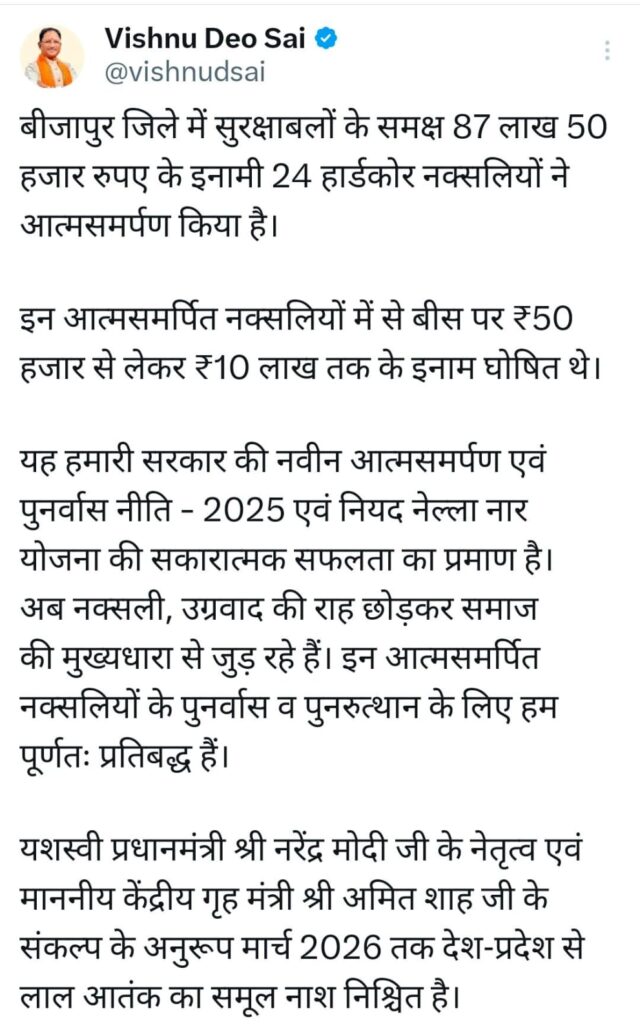 मुख्यमंत्री श्री साय ने कहा कि माओवाद प्रभावित क्षेत्रों को शासन की योजनाओं से जोड़ने नियद नेल्लानार, पीएम जनमन जैसी योजनाएं चलाई जा रही हैं, जिसका सकारात्मक बदलाव अब बस्तर में दिखने लगा है। माओवाद की समाप्ति के साथ ही बस्तर विकास की ओर तेजी से बढ़ेगा। उन्होंने ऑपरेशन में शामिल सभी जवानों को अपनी शुभकामनाएं देते हुए उनकी बहादुरी के लिए बधाई दी। इस अवसर पर उप मुख्यमंत्री श्री विजय शर्मा ने कहा कि इस ऑपरेशन और जवानों की बड़ी और ऐतिहासिक सफलता की सराहना राष्ट्रीय और अंतर्राष्ट्रीय स्तर पर भी हो रही है। उन्होंने कहा कि अब बस्तर में बड़ा और सकारात्मक परिवर्तन होने जा रहा है जो विकास और प्रगति की राह पर बस्तर को ले जाएगा।