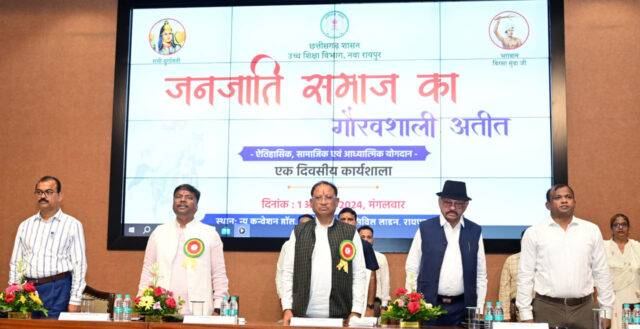 रायपुर : मुख्यमंत्री श्री विष्णु देव साय ने भगवान बिरसा मुण्डा की जयंती के अवसर पर 15 नवंबर को छत्तीसगढ़ के हर जिले में ’जनजातीय गौरव दिवस’ मनाने की घोषणा की है। उन्होंने कहा कि प्रधानमंत्री श्री नरेन्द्र मोदी ने 15 नवंबर को भगवान बिरसा मुण्डा की स्मृति में जनजातीय गौरव दिवस मनाने का निर्णय लिया है। इस वर्ष भगवान बिरसा मुण्डा की 150वीं जयंती है। छत्तीसगढ़ में भी इसे भव्य रूप से मनाया जाएगा। मुख्यमंत्री आज राजधानी रायपुर के न्यू सर्किट हाउस में ’जनजातीय समाज का गौरवशाली अतीत, ऐतिहासिक, सामाजिक एवं आध्यात्मिक योगदान’ विषय पर आयोजित एक दिवसीय कार्यशाला को संबोधित कर रहे थे। कार्यक्रम की अध्यक्षता वन मंत्री श्री केदार कश्यप ने की। विधायक श्री भईयालाल राजवाड़े विशेष अतिथि के रूप में कार्यक्रम में उपस्थित थे।